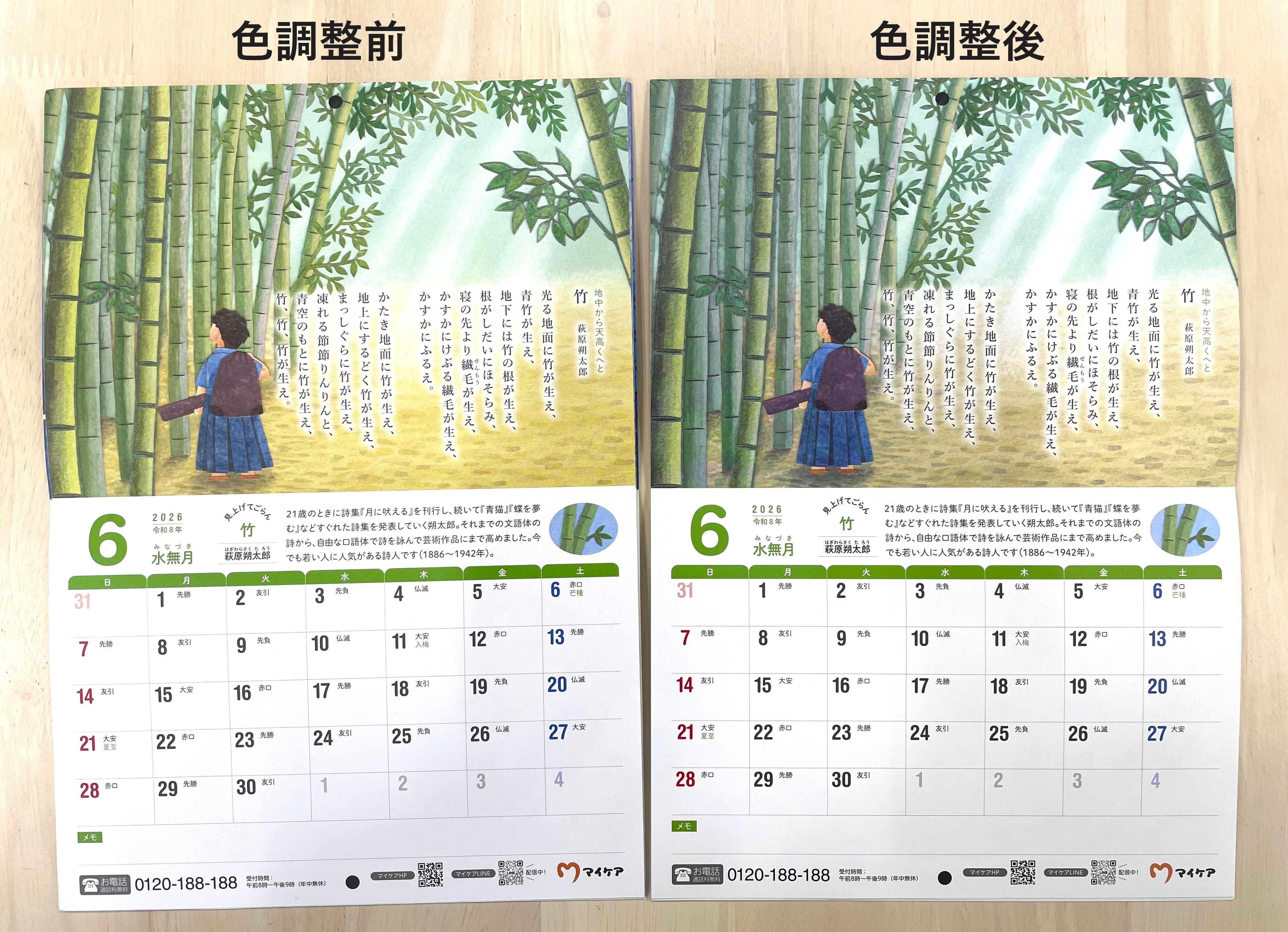 ありがたいことに毎年好評をいただきマイケアカレンダーの発行は2026年で16冊目となります。一年手元においていただけるよう、制作の内容はもちろん、印刷時にとても大事にしているのが元気を感じる「色味」です。